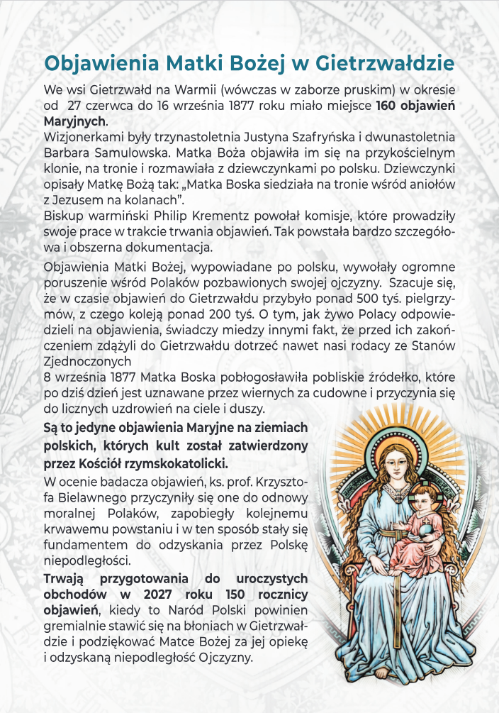 „Objawienia w Gietrzwałdzie – 160 objawień maryjnych miejsce we wsi Gietrzwałd na Warmii (wówczas w zaborze pruskim 27 czerwca a 16 września 1877 roku).”
