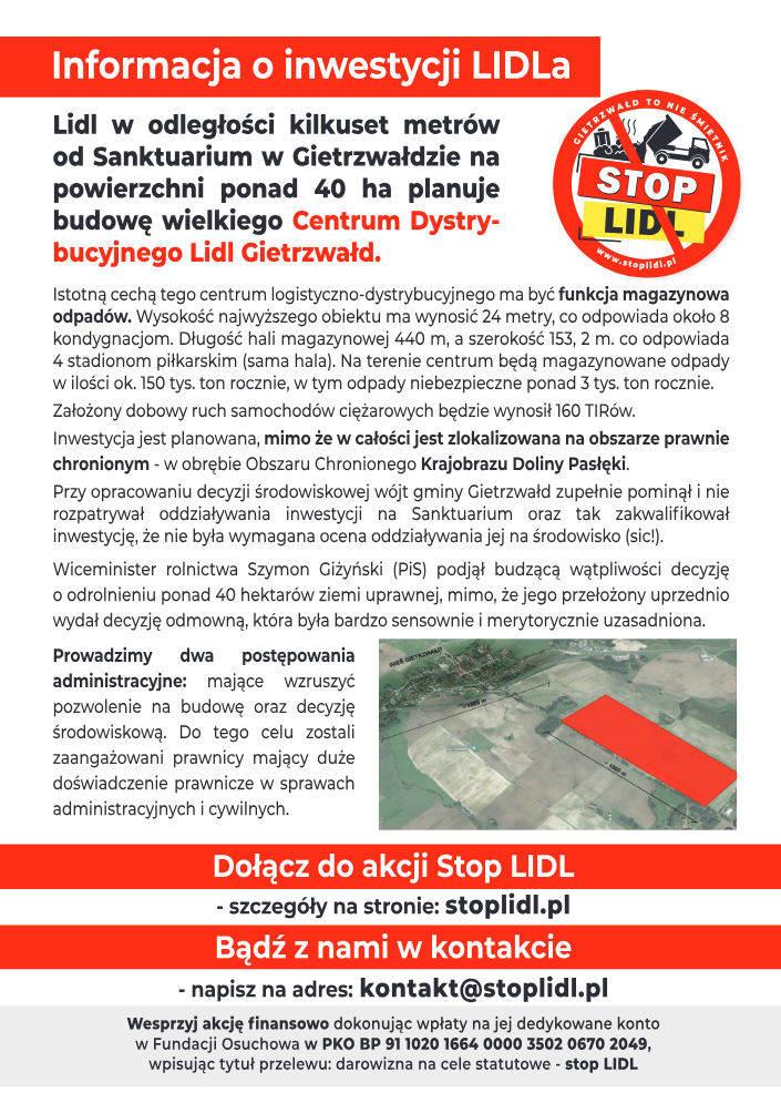 Firma Lidl w odległości kilkuset metrów od Sanktuarium w Gietrzwałdzie planuje budowę wielkiego Centrum Dystrybucyjnego Lidl Gietrzwałd!