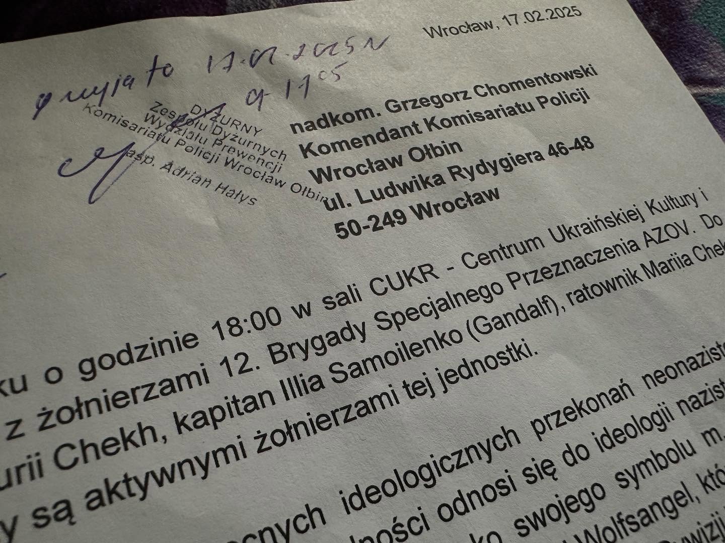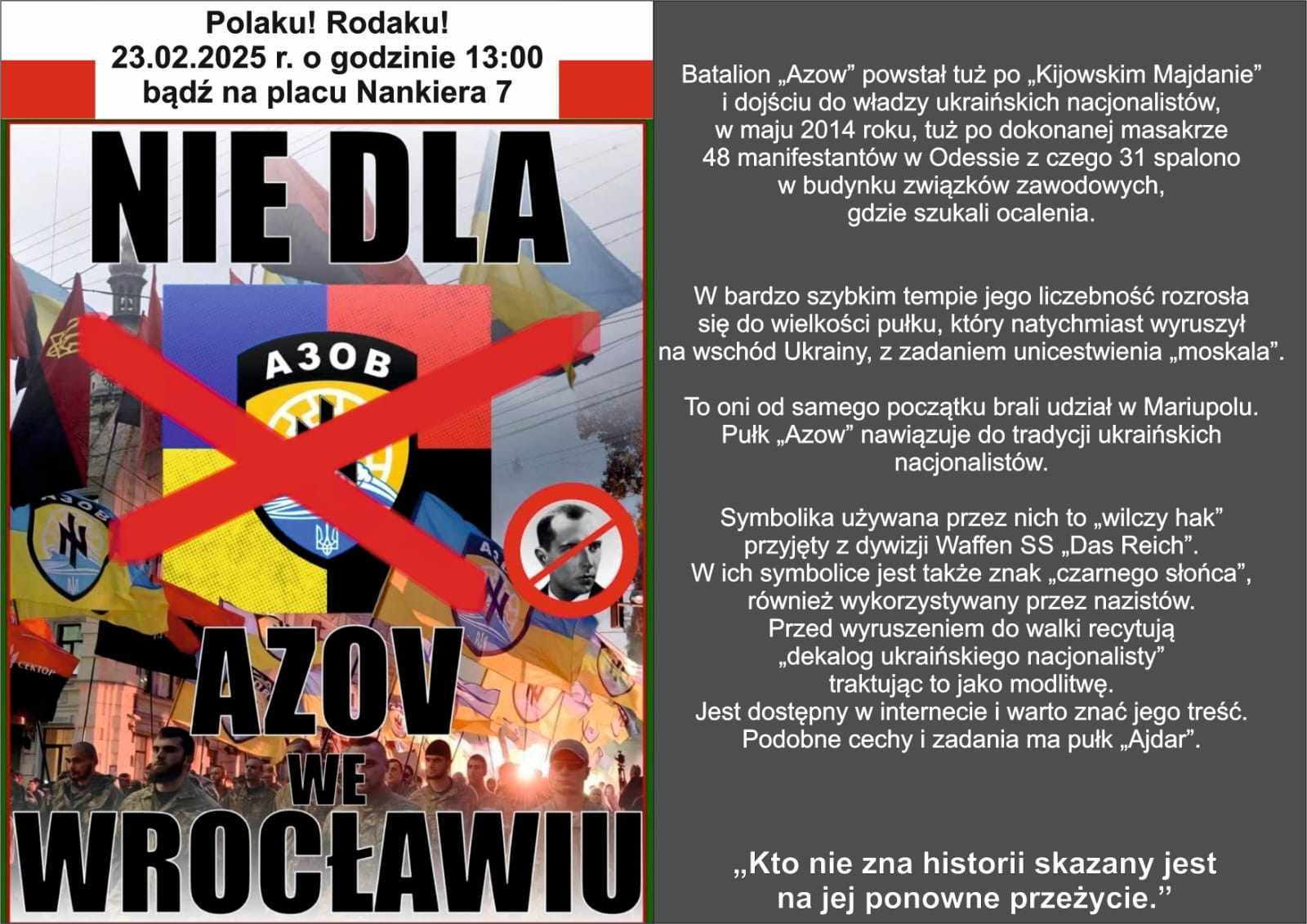 W dniu 17 lutego 2025 roku o godzinie 18:00 w sali CUKR – Centrum Ukraińskiej Kultury i Rozwoju miało miejsce spotkanie z żołnierzami 12. Brygady Specjalnego Przeznaczenia AZOV. Jednostka ta zasłynęła z bardzo mocnych ideologicznych przekonań neonazistowskich i neobanderowskich. W swojej dotychczasowej działalności odnosi się do ideologii nazistowskiej, ale także symboliki.